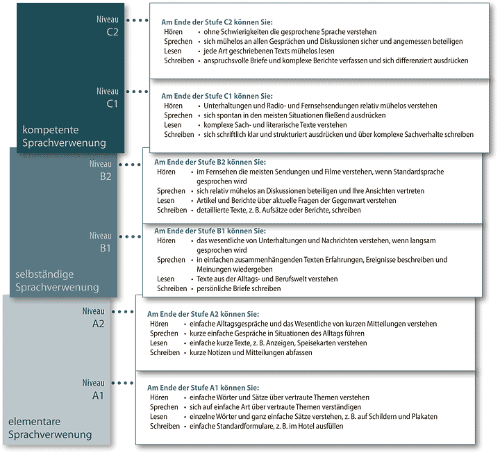Die Sprachkurse des vhs-Zweckverbandes richten sich nach den Empfehlungen des Gemeinsamen Europäischen Referenzrahmens (GER). Der GER ist ein europäisches Stufenmodell, das die jeweiligen sprachlichen Fertigkeiten in den Bereichen Hören, Lesen, Sprechen und Schreiben in einem Raster von sechs international vergleichbaren Kompetenzstufen festlegt: A1, A2, B1, B2, C1, C2. Für Sie als Sprachkursteilnehmer hat das folgende Vorteile: Sie können Ihre eigenen Lernfortschritte gut verfolgen. Jede Stufe enthält Beschreibungen, die im Detail definieren, was Sie bei regelmäßiger, aktiver Mitarbeit am Ende der jeweiligen Kompetenzstufe erreicht haben können.